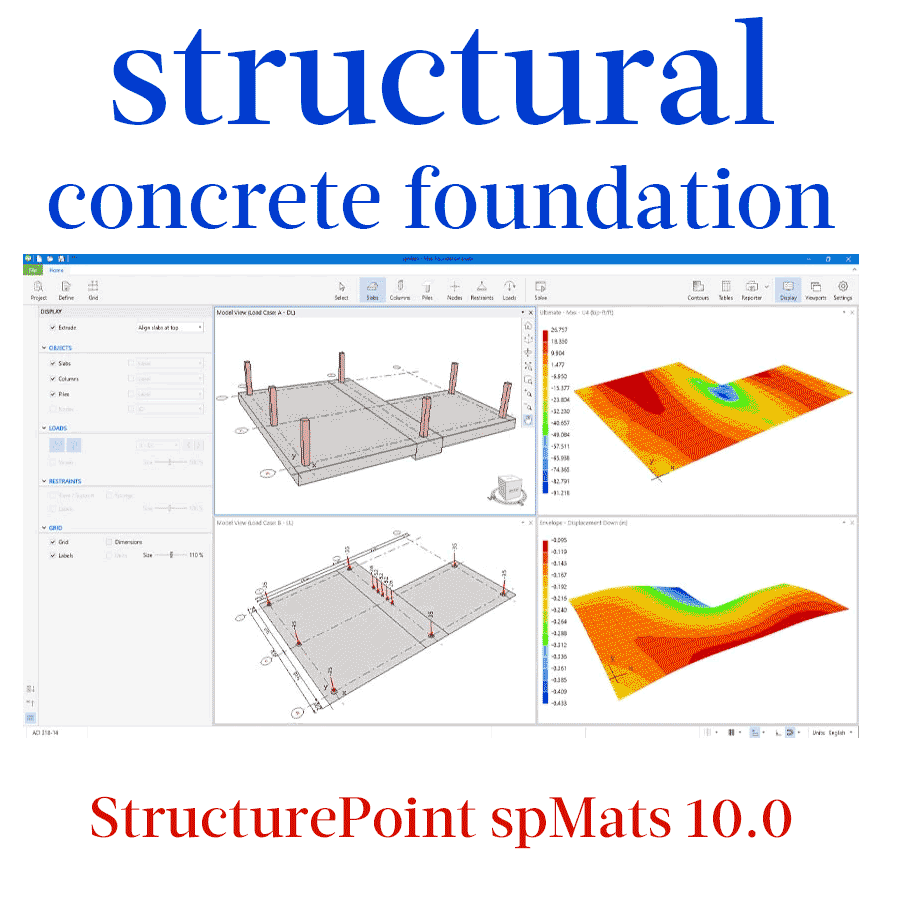 This software was formerly known as pcaMats and MATS and in recent years has changed to its new name, spMats. With this product it is possible to analyze and design different types of concrete, composite or reinforced concrete slabs. The concrete slabs in this program are modeled using a combination of assembly elements, which makes it easy to design this type of foundations.